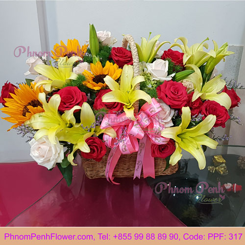 Tasteful and elegant arrangement of Mixed Cut flower basket of lily, sunflower and rose. When you want the family or friend to know that you send them your best wishes, this is simply the perfect choice.